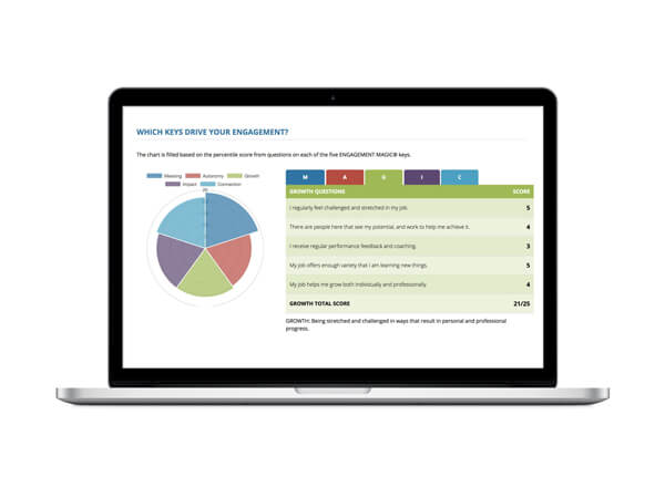 Bu araç, bir kişinin yaptığı işteki tatmin ve genel bağlılık seviyesini ölçen 35 farklı konuya ek olarak, bağlılığa lokomotiflik eden MAGIC® (SİHİR) anahtarlarını da içerir.